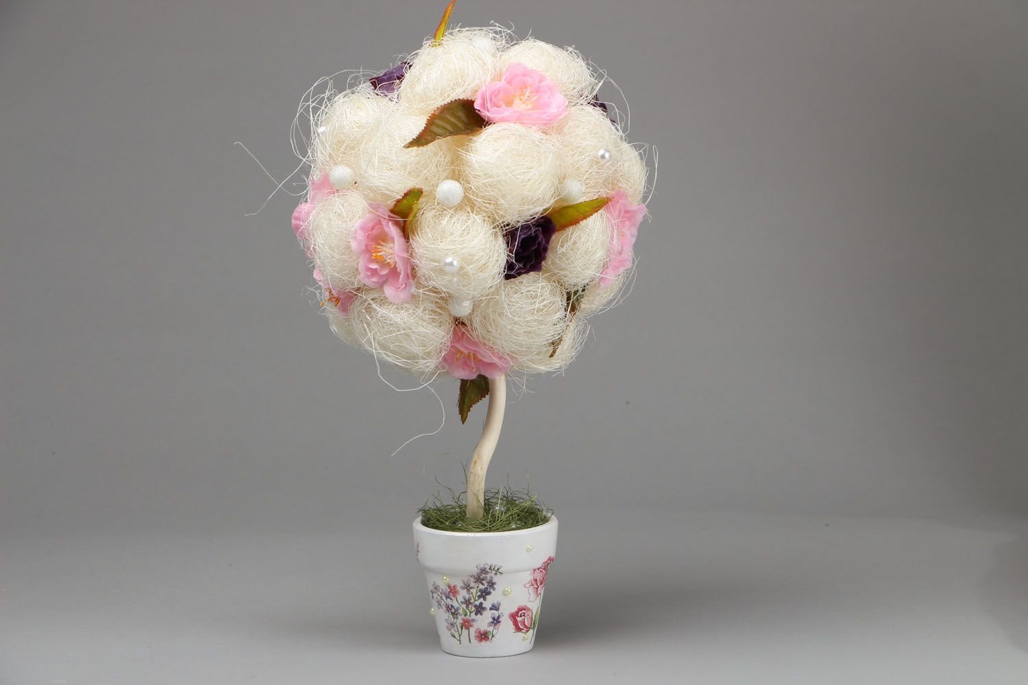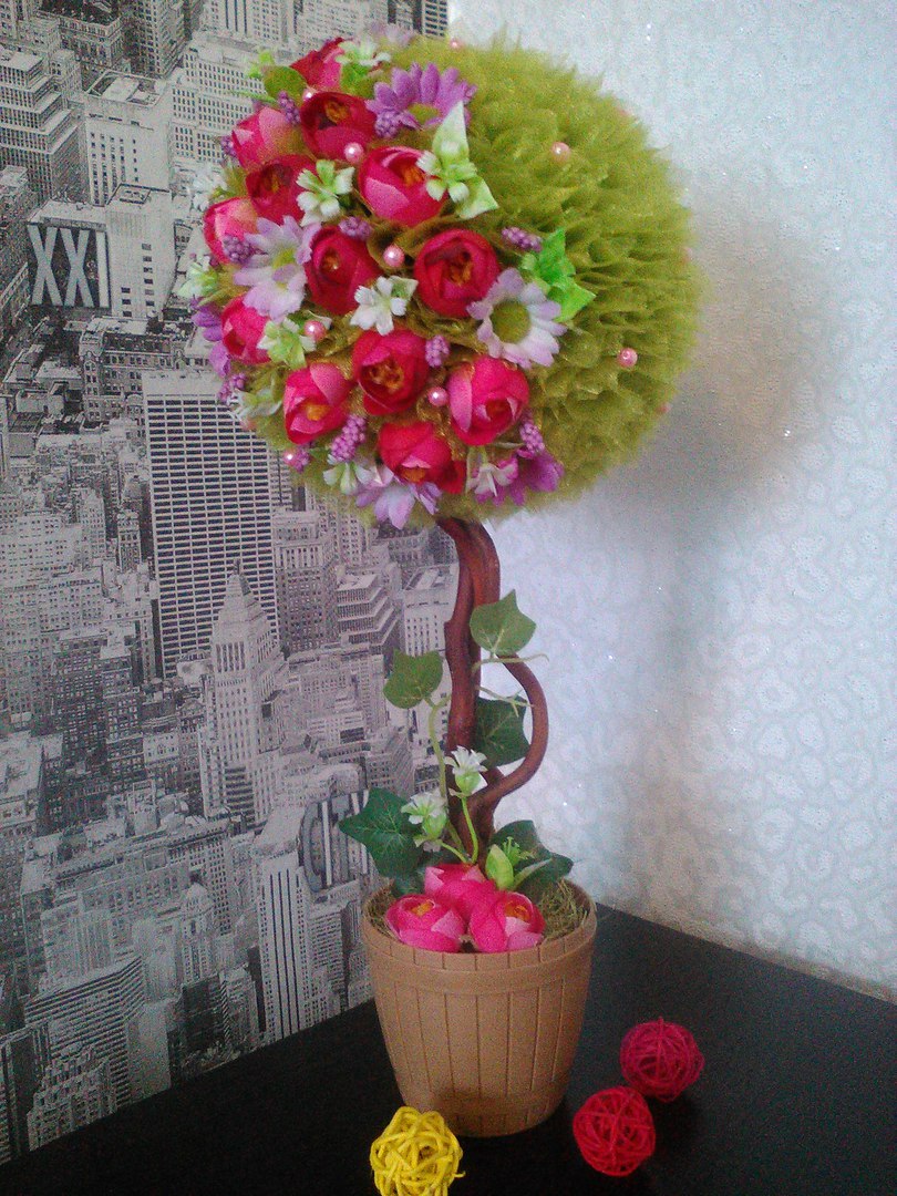 При изготовлении топиария можно комбинировать несколько вариантов украшения, например, использовать покупные искусственные цветы и органзу.