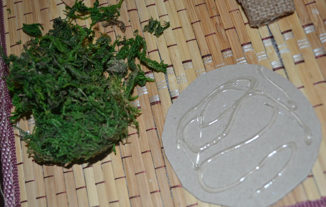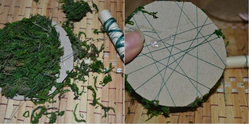 Из тонкого картона вырезаем дубликат кроны. Наносим клей и фиксируем на нем мох.
