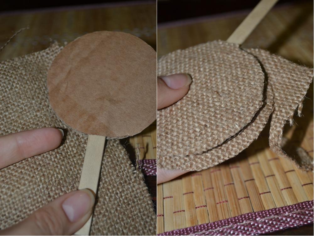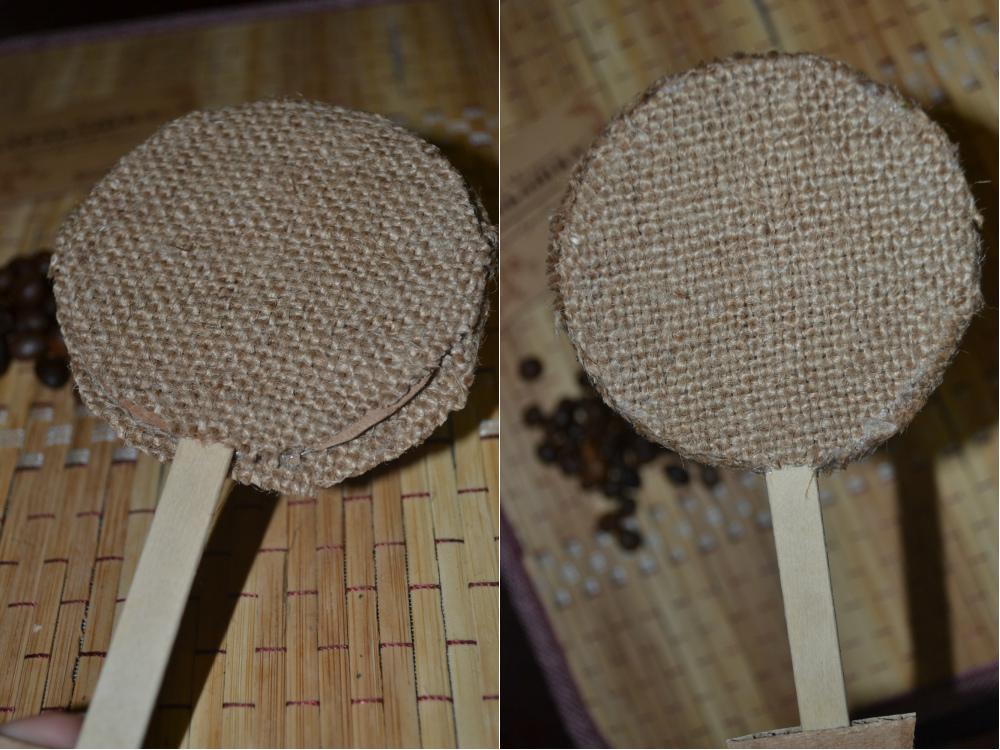 Приклеиваем мешковину с двух сторон. С одной диаметр кругляшка мешковины равен диаметру картона, с другой диамент мешковины должен быть немного больше. Это нужно для того, чтобы мешковиной скрыть торцы картонной заготовки. Тогда задняя часть деревца будет выглядеть аккуратней.