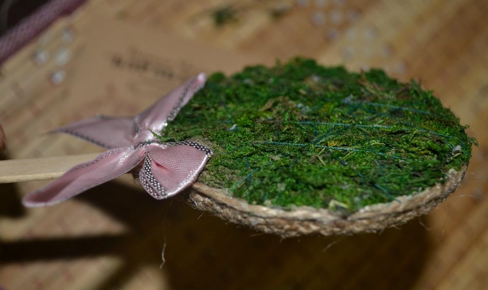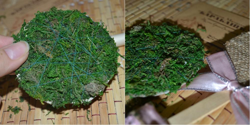 С помощью зеленой нити (под цвет мха) фиксируем мох.