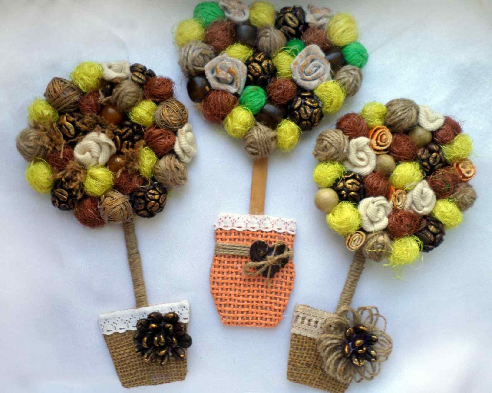Украшать такие миниатюрные деревца можно так, как подскажет Вам Ваша фантазия и имеющиеся в наличии материалы.