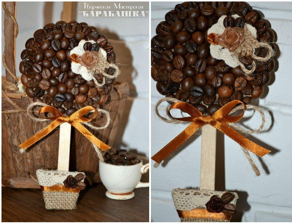 Зернышки лучше клеить выпуклой стороной вниз, так вид готового изделия выходит более декоративным. Из атласной ленты нужно собрать небольшую «ромашку», зафиксировав ее центр капелькой клея. Расположив «ромашку» в верхней части кофейной кроны, поверх нее можно крепить декоративный цветок. Эйфелевую башню лучше расположить на небольшом отрезке декоративного шнура как подвеску.