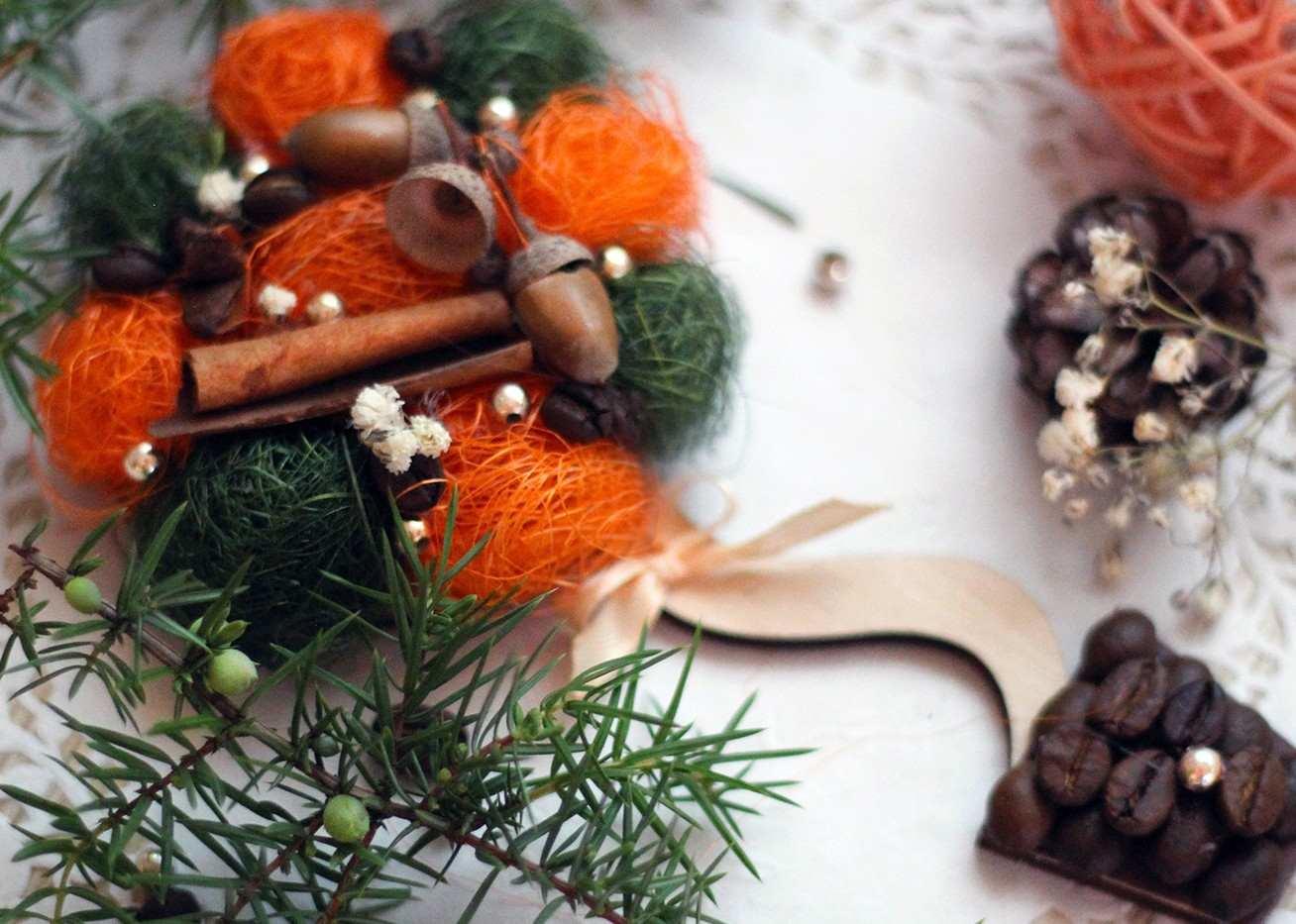У меня сегодня мандариновое дерево, поэтому использую шарики из сизаля и декоративные мандаринки.