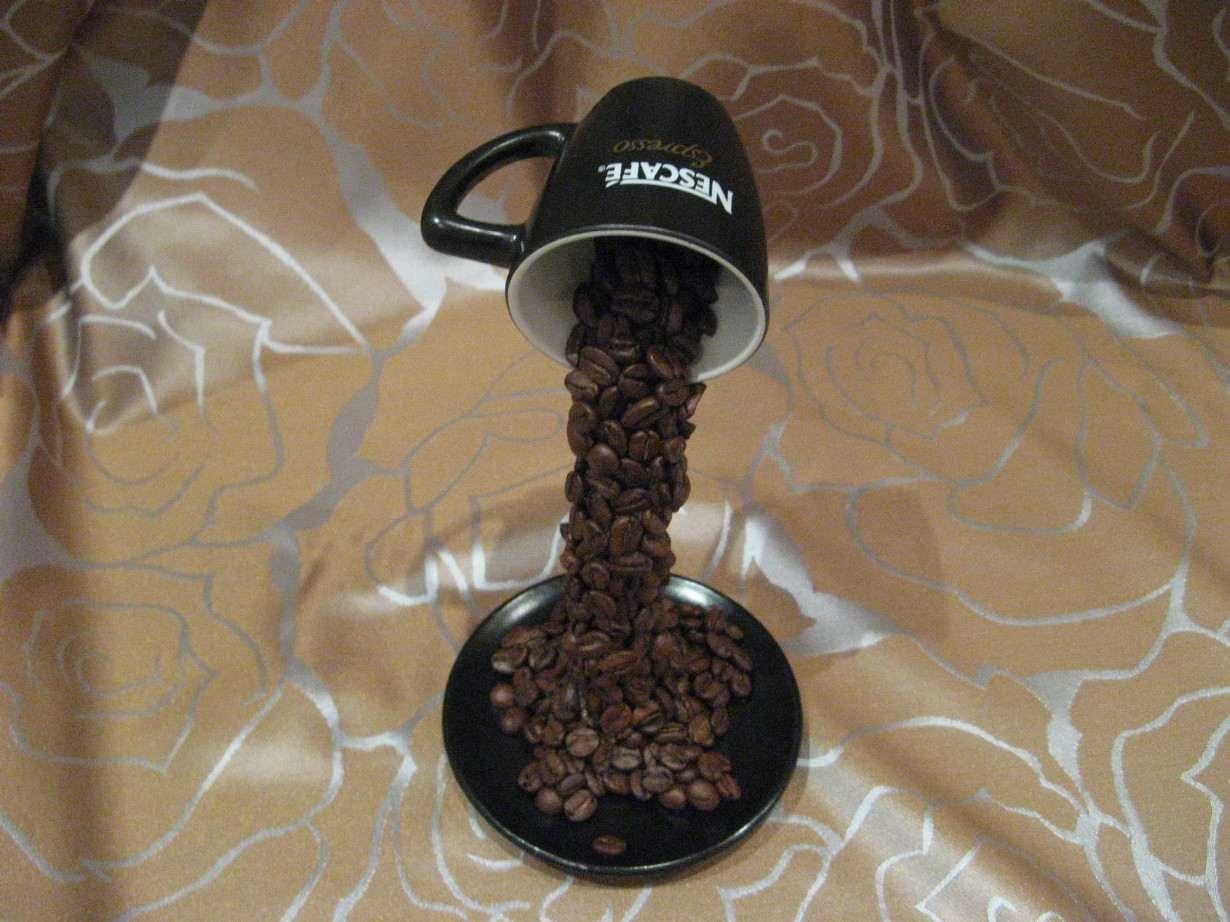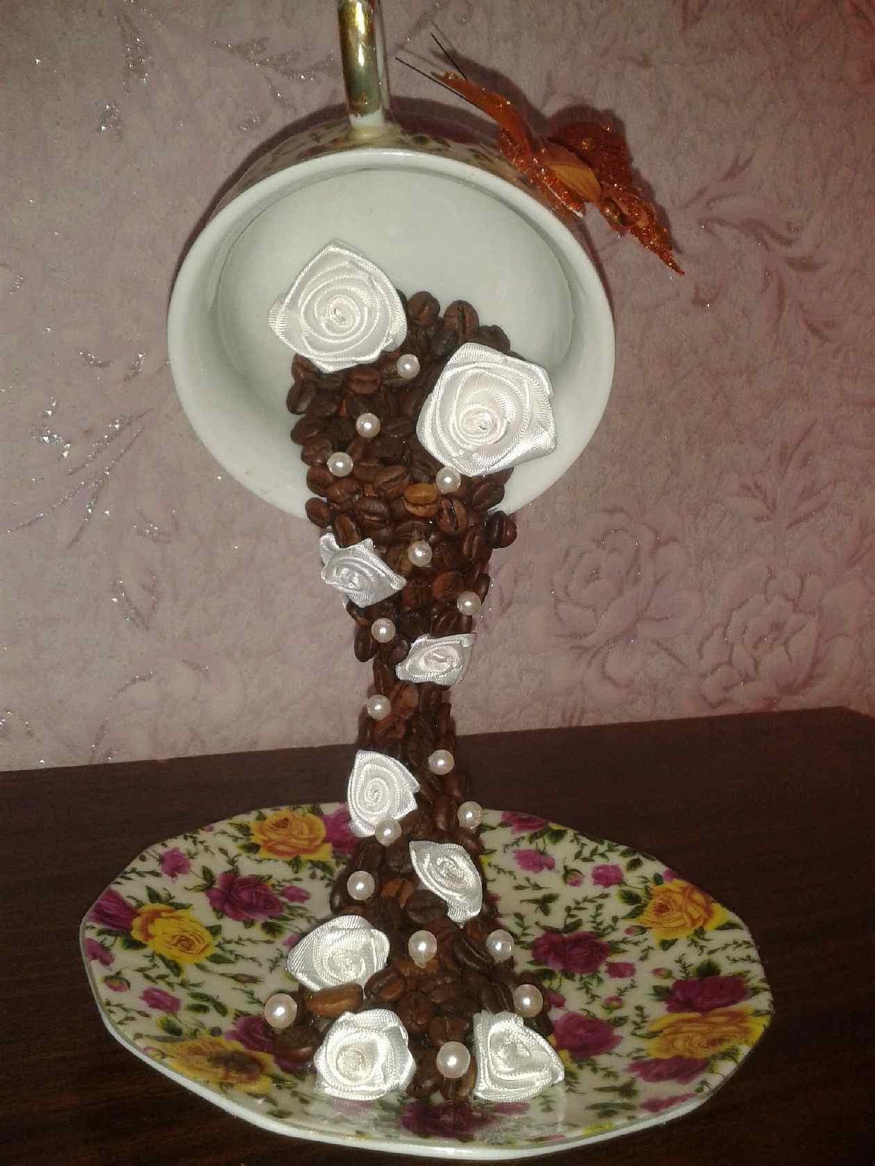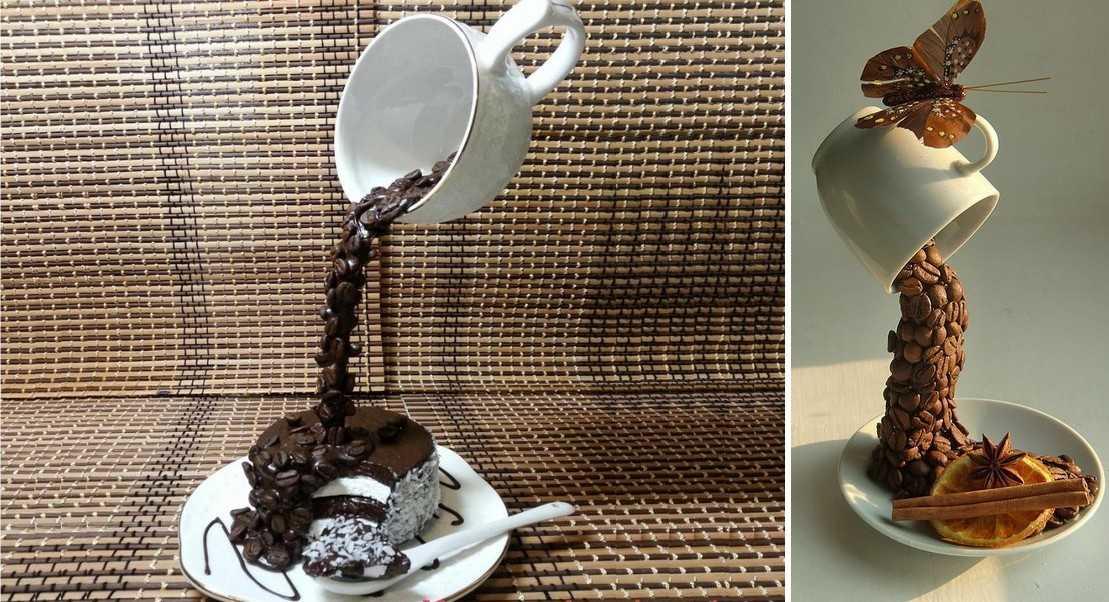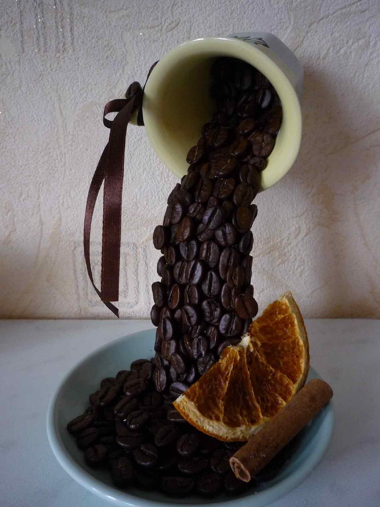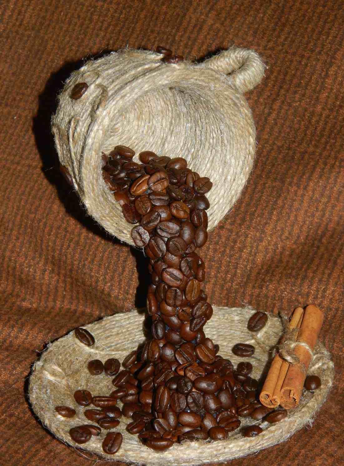 Имитировать льющийся кофе можно с помощью кофейных зерен, порошка корицы или обычной акриловой краски. Если парящая чашка будет оклеена кружевом или обернута веревочным шпагатом, это внесет изюминку в изделие, придаст ему особый стилевой колорит.
