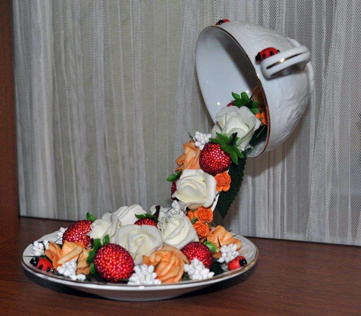 Что будет «изливать» летящая чашка, зависит от идеи автора. Это могут быть искусственные цветы и листья, новогодние бусы, мох или сизаль (волокно из листьев агавы) и прочие интересные мелочи.