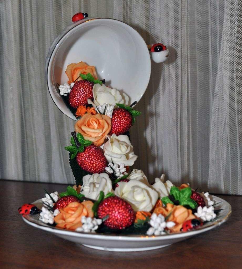 В комплект необходимых материалов всегда входит чайная либо кофейная пара – чашка и блюдце. Их соединяют в единую композицию с помощью толстой проволоки или обычной вилки.