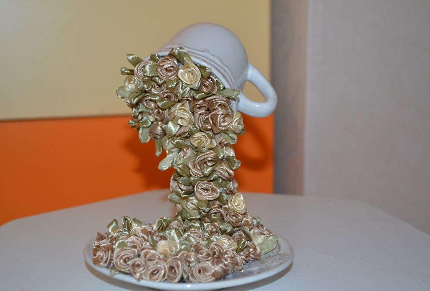 Топиарий из чашки сделать несложно, главное – выбрать, что будет литься из кружки, а также набраться терпения, чтобы создать аккуратную поделку.