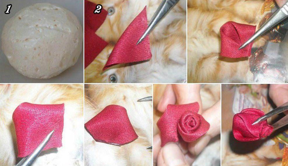 В качестве основания берется шар из макрофлекса, фиксируется на стволе. Для роз необходимо заготовить множество квадратиков ткани с длиной стороны около 5 см. Как изготовить лепесток – показано на рисунке. Для одной розы понадобится от 5 лепестков и выше – зависит от размера будущего бутона