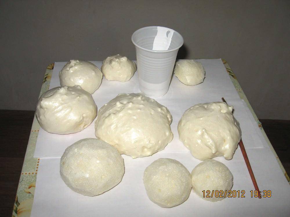 Можно сделать шар-основание и без использования воздушного шара. Нужно просто распылить пену на клеенчатую основу небольшим комочком, затем отсечь все лишнее после застывания при помощи ножа или жестяной банки круглой формы