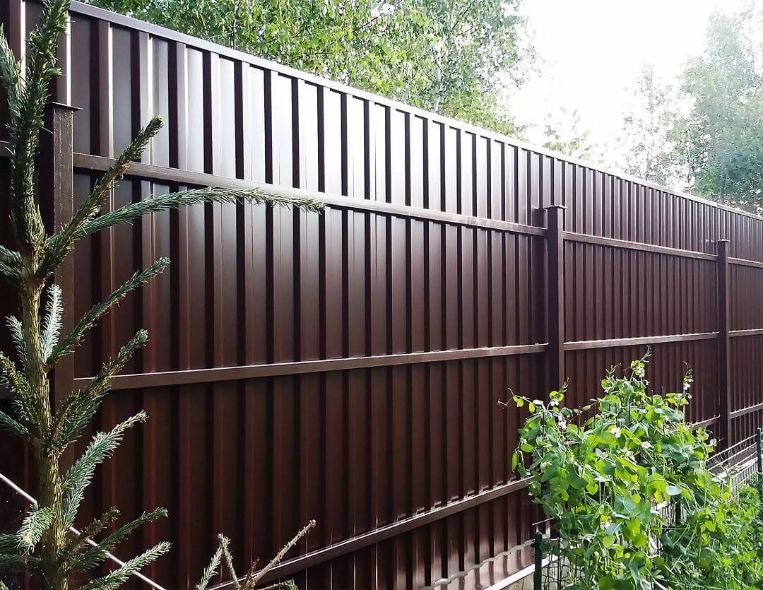 Расскажем о том, как провести установку профнастила своими руками без сварки, на примере самой простой и быстрой технологии с использованием пластин-держателей. Для реализации данного способа вам потребуются лаги из металлического профиля сечением 40×20 мм со стенками толщиной 2мм (в идеале длина пролета забора должна совпадать с длиной перекладин). Что касается высоты забора, то если она будет не более 2 метров, достаточно двух рядов перекладин, а если выше – то трех.