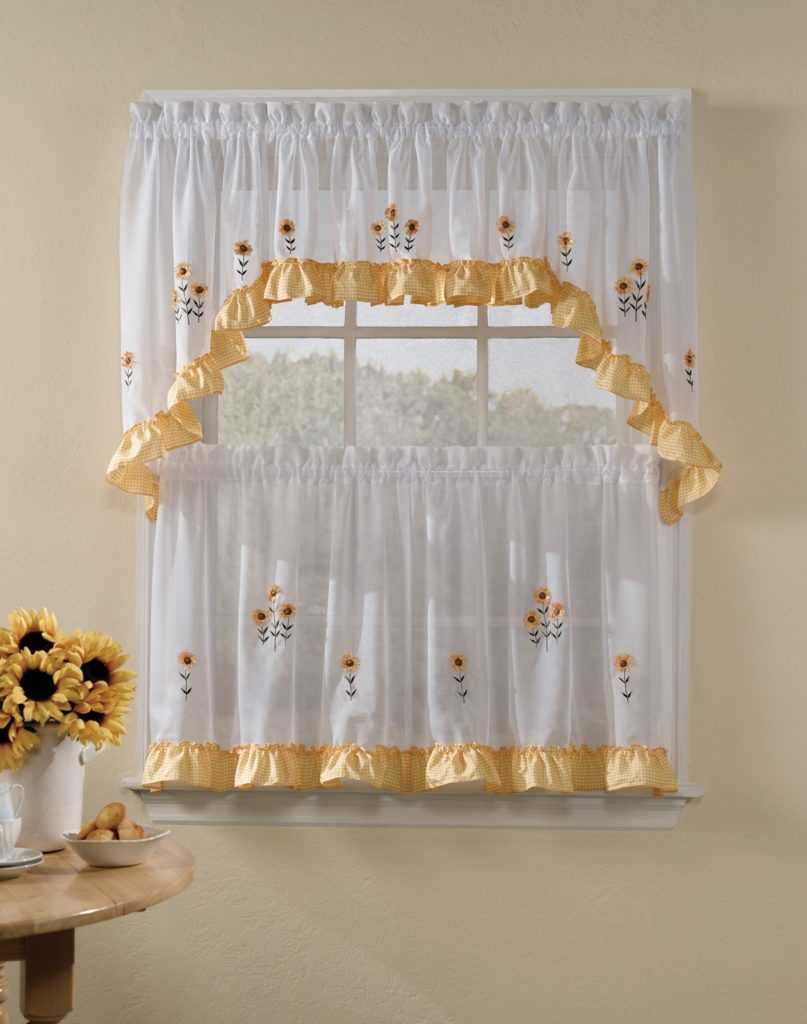 Тюль для кухни короткая удобна в уходе и оригинальна. Она не настолько массивны, как первый вариант.