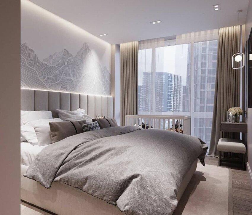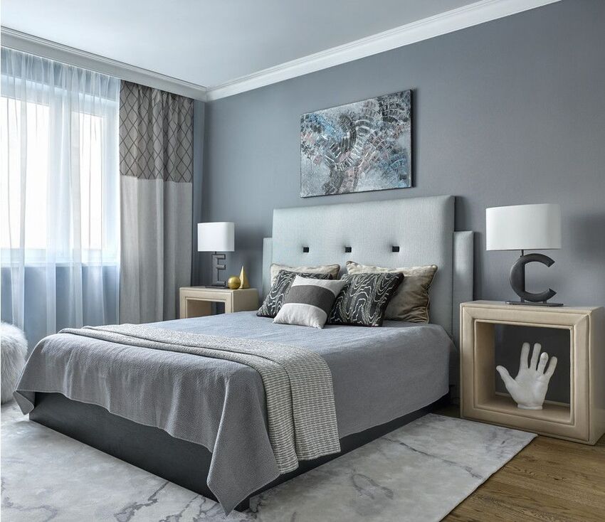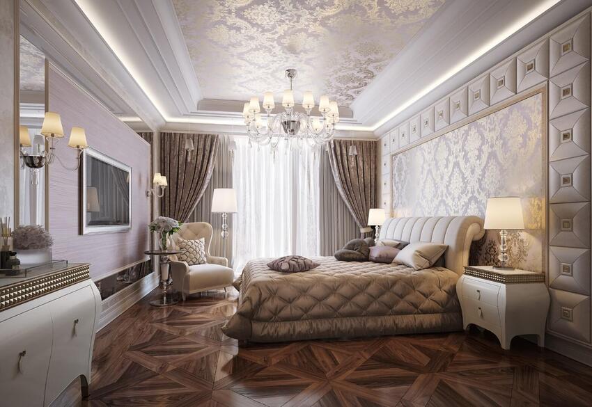 Если в спальне присутствует большое количество декоративных элементов, следует отдать предпочтение однотонному светлому полотну, которое не будет визуально перегружать спальню.
