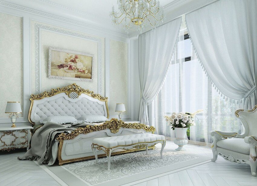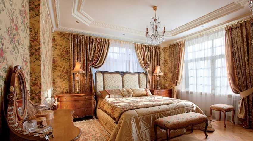 В классических спальнях акцент делается на богатое убранство и обилие декора. Поэтому для такого стиля следует выбирать органзу или легкую вуаль, которые смогут оттенить тяжелые шторы из бархата или жаккарда.