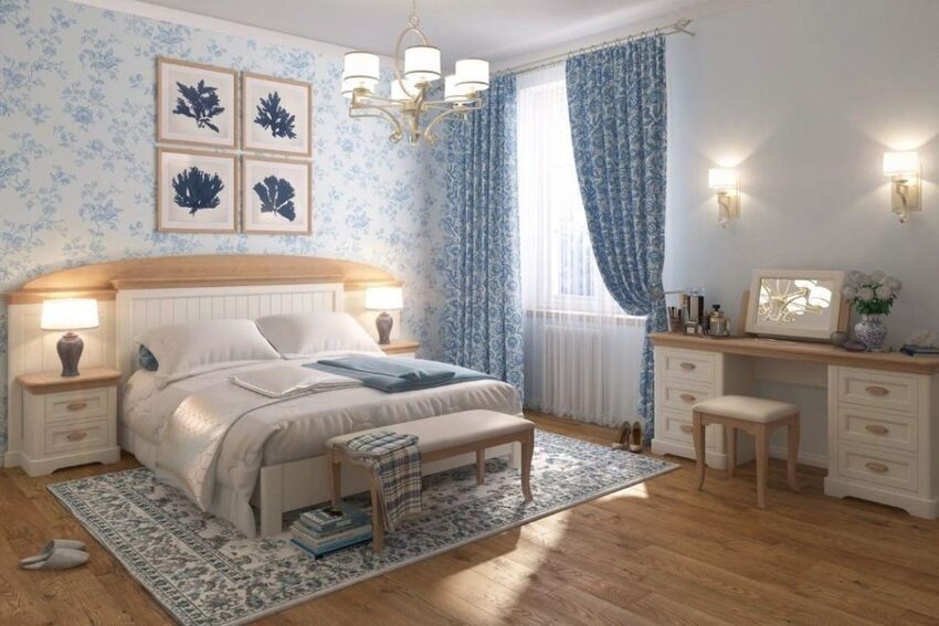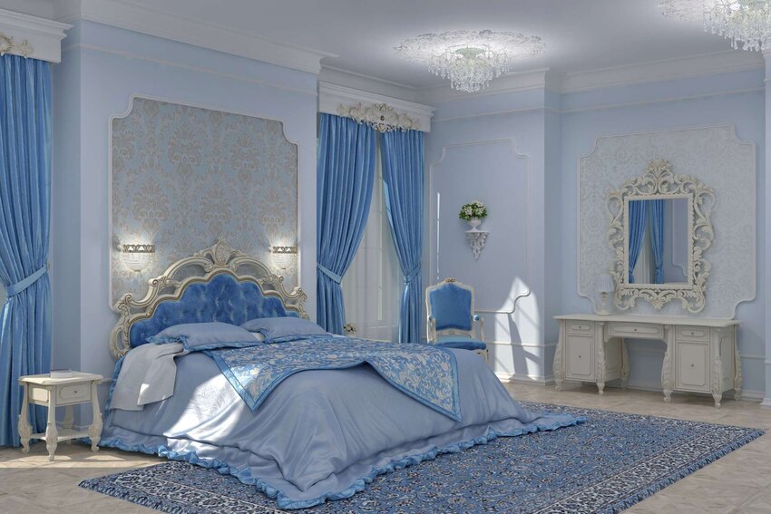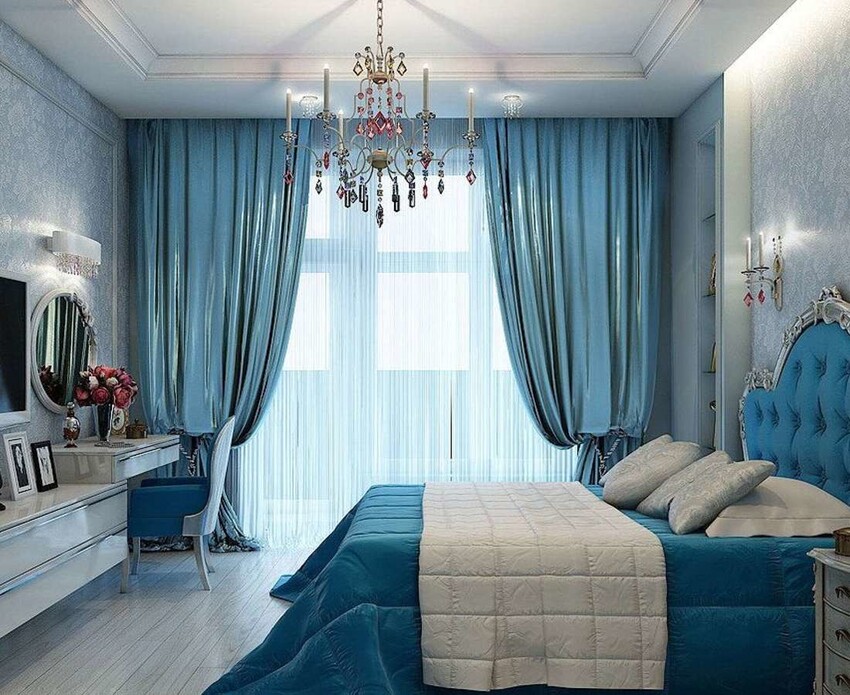- Морской. Пышные гардины, окрашенные в холодные тона синего. Легкость, свежесть привнесет драпировка. Ламбрекен — строгость.