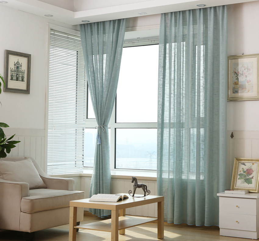 - Минимализм. Цвета отражают спокойствие. Однотонный воздушный занавесь — все, что потребуется. Допустима комбинация с жалюзи.