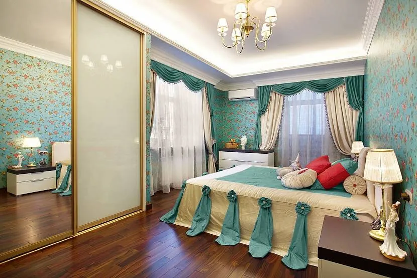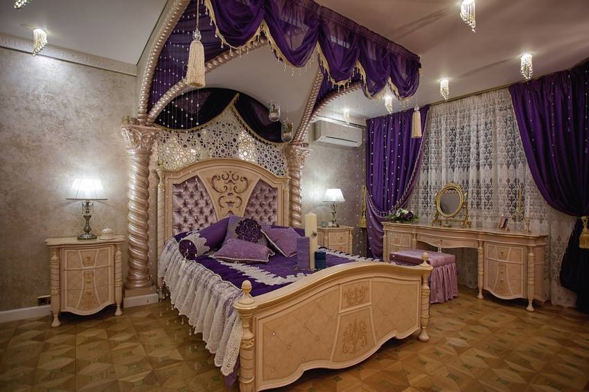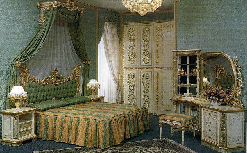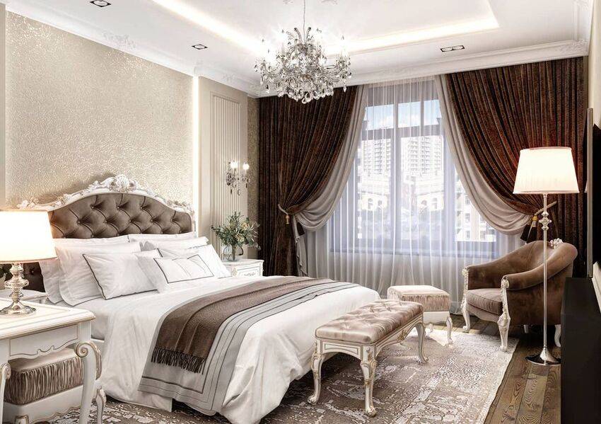 Спальни, оформленные в стиле арт-деко, барокко, классика и модерн, напротив, тяготеют к использованию портьер, ламбрекенов, воланов, подхватов и прочих декоративных элементов.