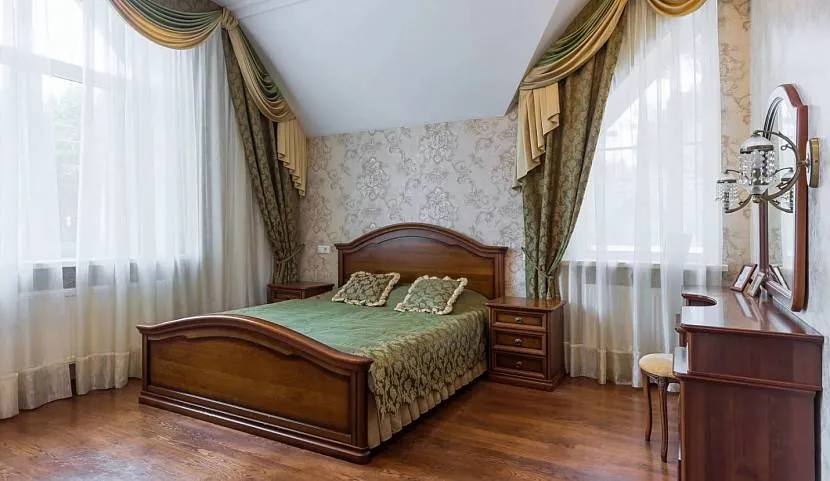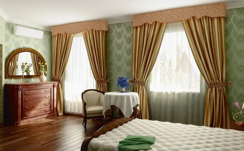 Они по праву остаются одним из лучших вариантов оформления оконных проемов в спальне. Но обычно предпочтение отдается однотонным шторам. Потому что имеют пышную драпировку.