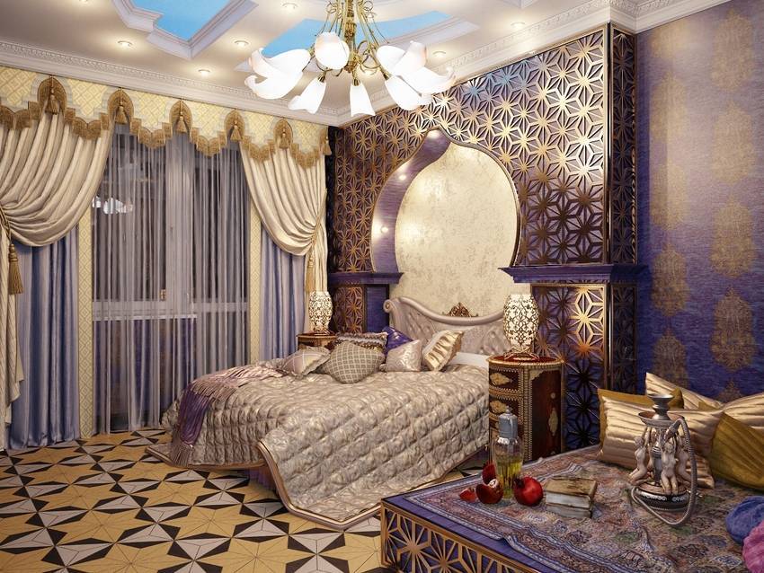 Допускается использование ярких цветов, золотого напыления и прочих элементов, добавляющих интерьеру этнических мотивов.