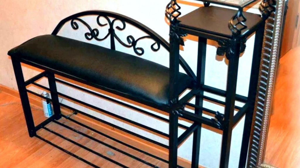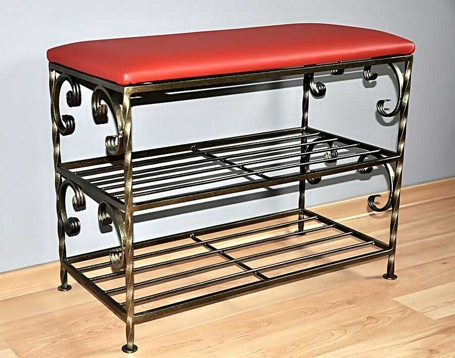 Однако необходимо при покупке обращать внимание на их качество. Деревянные конструкции дополнительно, должны быть обработаны антисептиками и другими специальными составами. Кованная тумба для обуви с сиденьем и подставкой