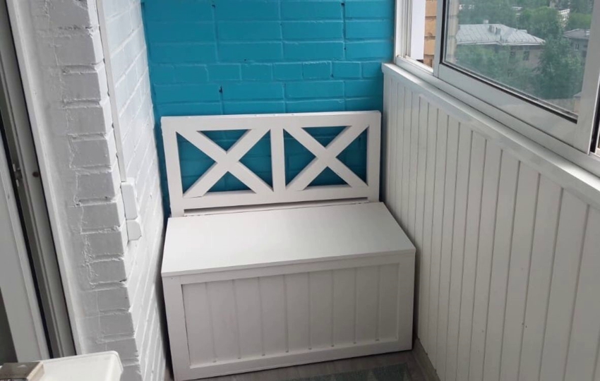 - Делаем тумбу у дальней стены, по всей ширине балкона, высотой комфортной для сидения, с откидной верхней крышкой. Заказываем или изготавливаем своими руками мягкое сидение, укладываем на верхнюю крышку. Летом на таком стуле приятно посидеть теплыми вечерами, в то же время есть куда складывать вещи.