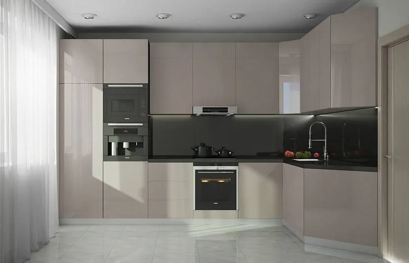 Бежевый фасад и черный фартук в форме буквы ГИсточник goldenplaza.com.ua
