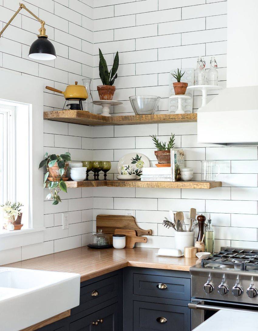 Еще одним достоинством открытой угловой полки является то, что вся кухонная утварь, расположенная на ней, находится в поле зрения хозяев. На таких конструкциях можно разместить предметы, которые используются наиболее часто.