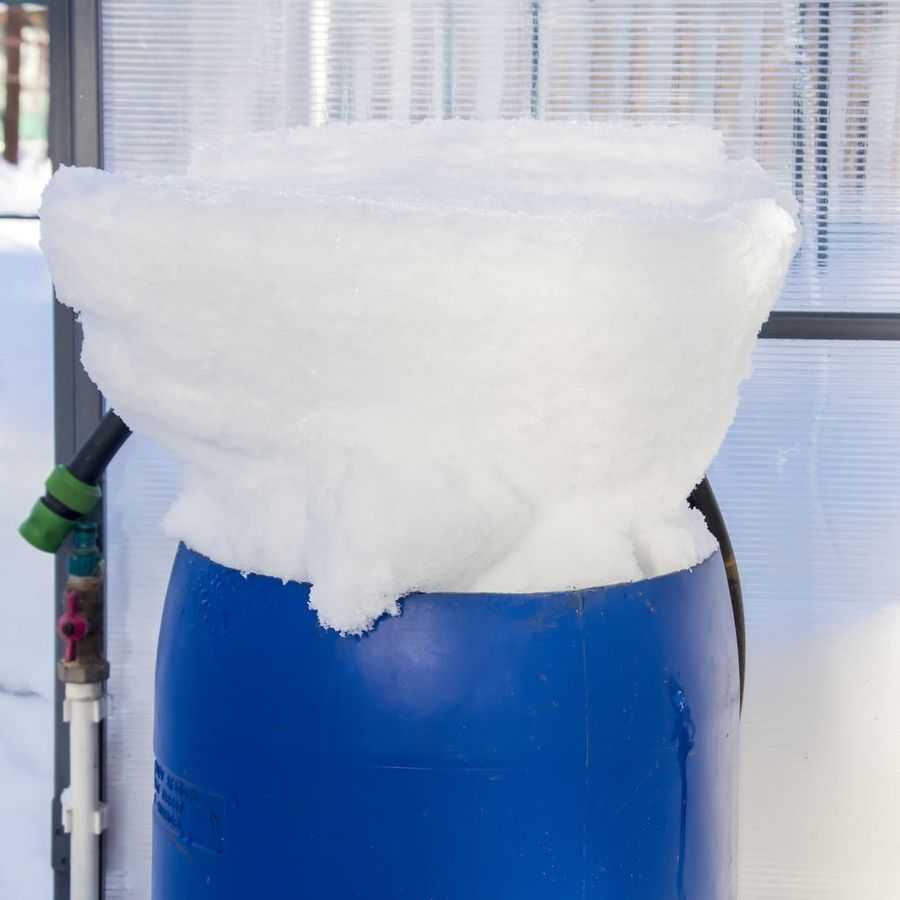 Для противников накидывания снега в теплицу есть другой выход, чтобы как следует увлажнить почву внутри сооружения, — это обильный полив талой водой. Её готовят заранее: в бочки поздней зимой накидывают снега – чем больше, тем лучше. Весной, когда начинаются работы в теплице, этими запасами хорошенько проливают грунт – жалеть сил и воду не надо. Конечно, много талой воды не соберёшь, тогда на помощь придёт дождевая. Специалисты не советуют проводить первый пролив почвы в теплице водой из скважины или колодезной – она жёсткая.