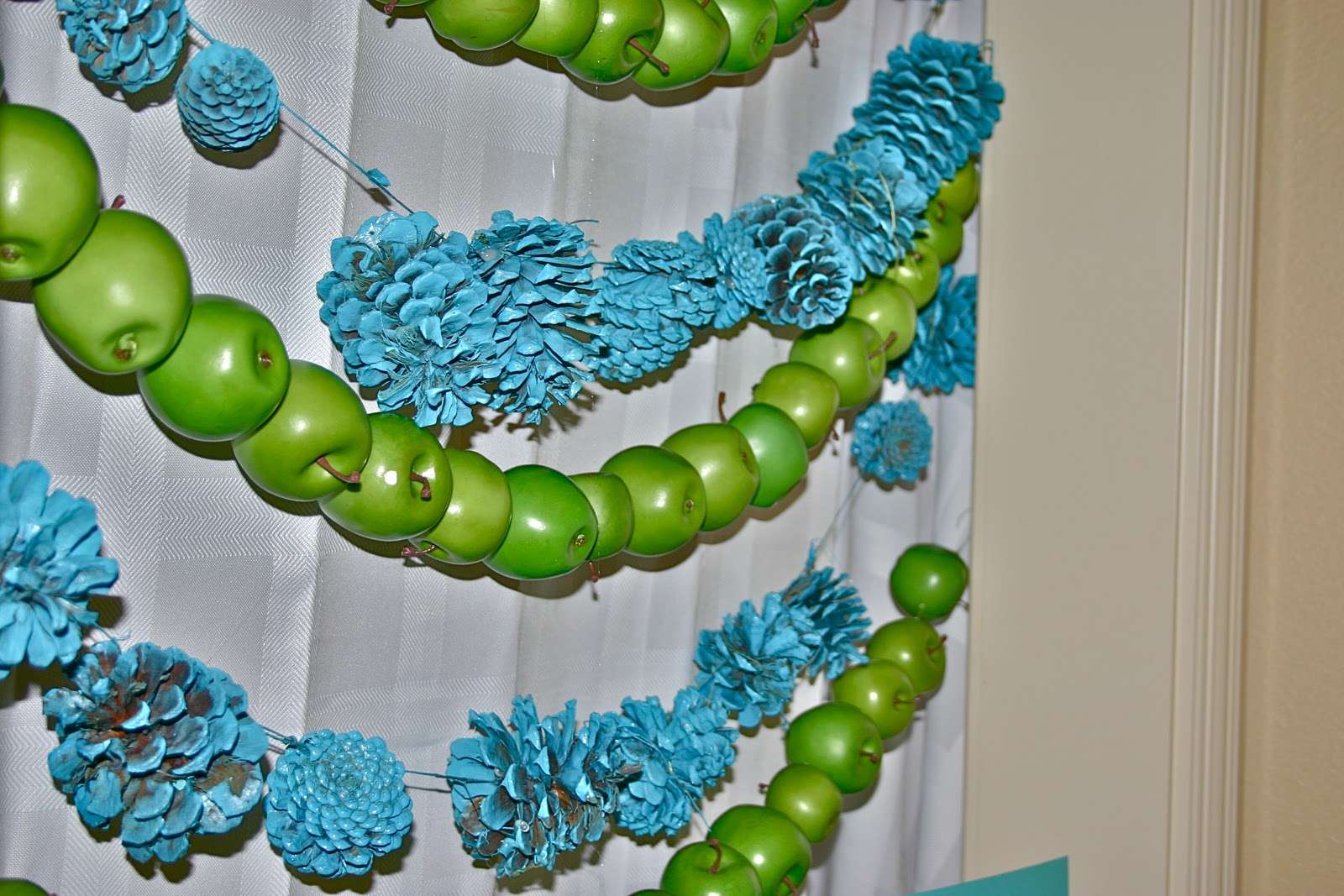 Такой декор дополняют окрашенными шишками, мишурой, либо вовсе вырезают игрушки из картона и цветной бумаги и приклеивают их на двухсторонний скотч. Красивые шары можно нанизать на прочную серебристую нить и натянуть ее от одной стены до другой – получится оригинальная гирлянда.