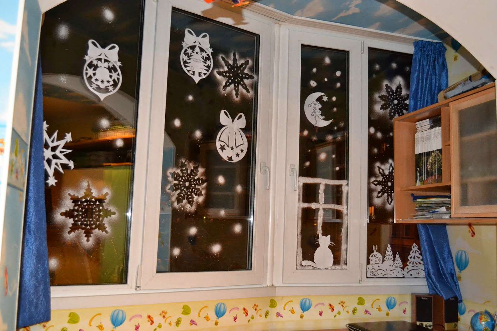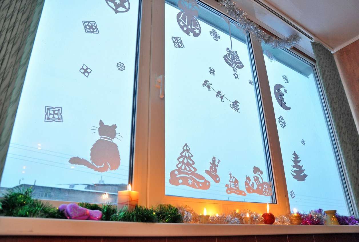 В магазинах накануне Нового года продаются специальные наклейки, которые легко наносятся и так же просто снимаются. Однако намного лучше, когда кто-то из семьи разрисовывает стекла сам.