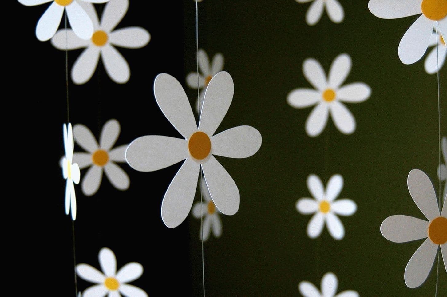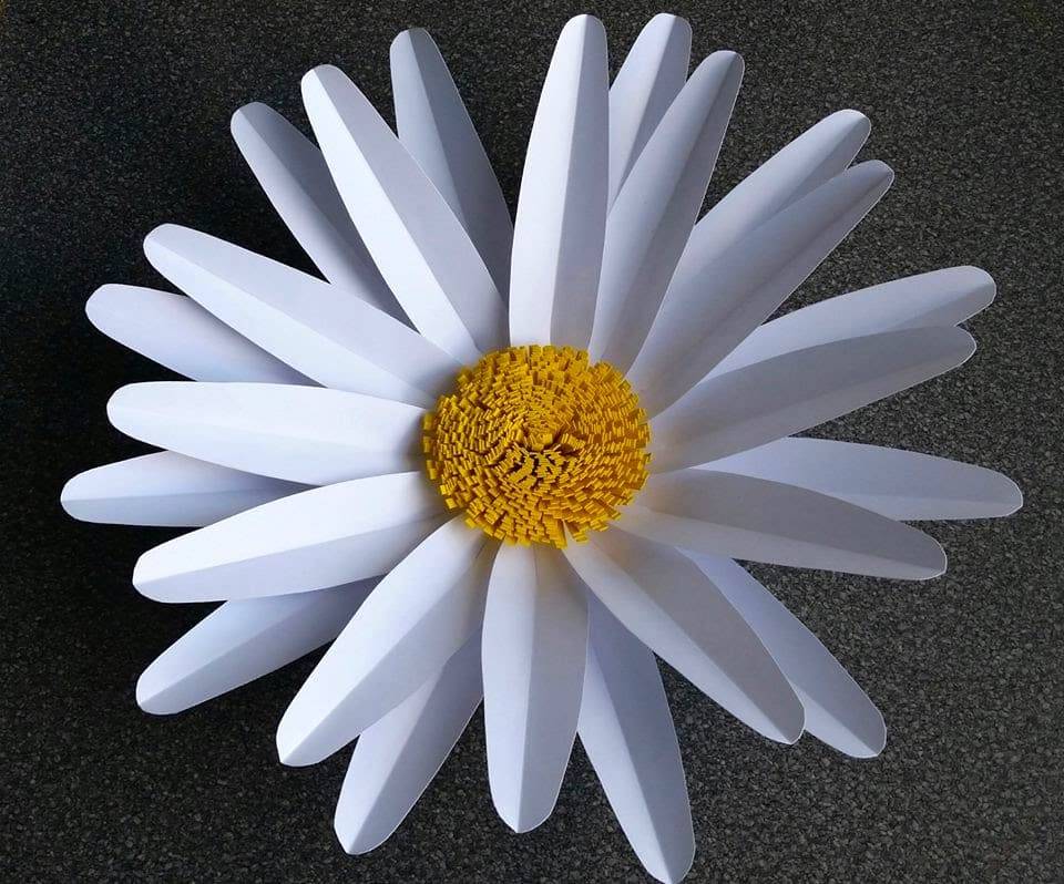Привнести в атмосферу любого помещения ощущение солнечного летнего дня позволят прелестные ромашки, для изготовления которых потребуется белая и желтая бумага. В качестве дополнительных инструментов необходимо подготовить клей, карандаш, циркуль.
