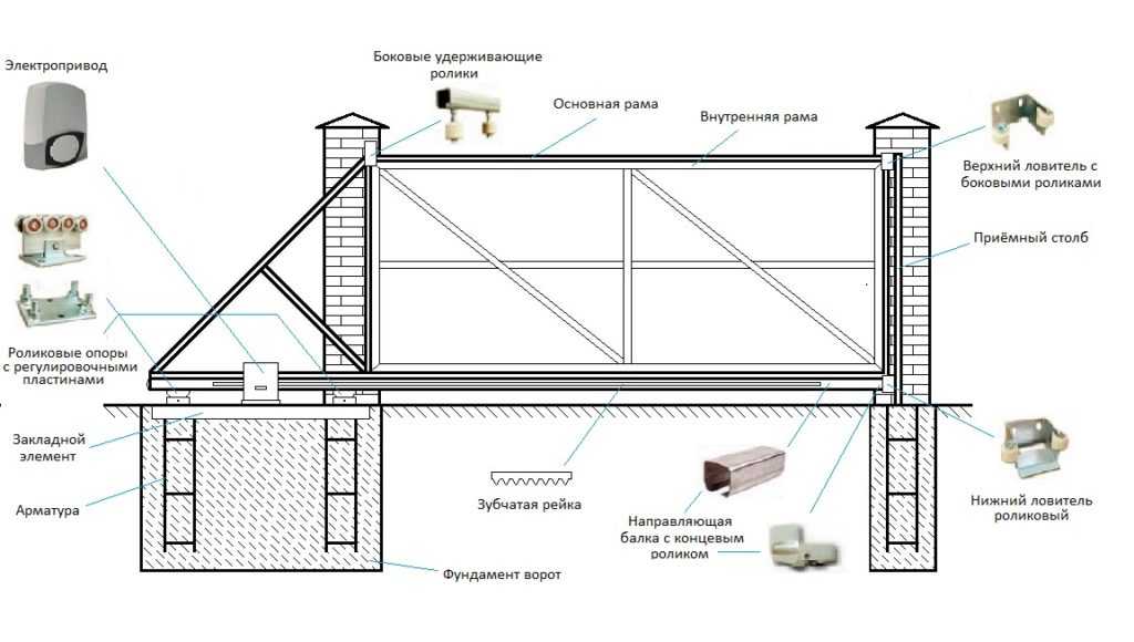 Откатные ворота состоят из нескольких главных узлов (рис. 1), отличающихся друг от друга не только внешним видом и строением, но и функциями. Схемы такой системы (рис.2) включают в себя следующие элементы: