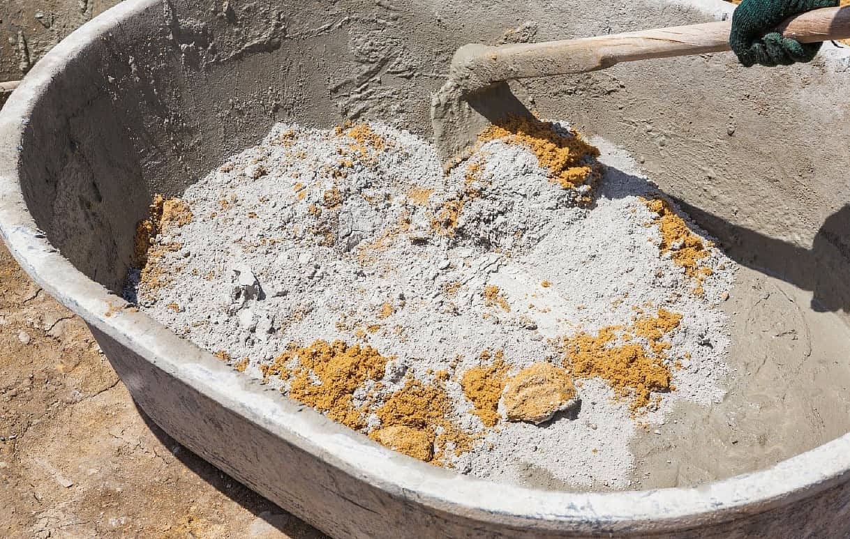 - Емкость для замеса бетона и сама цементно-песчаная смесь.