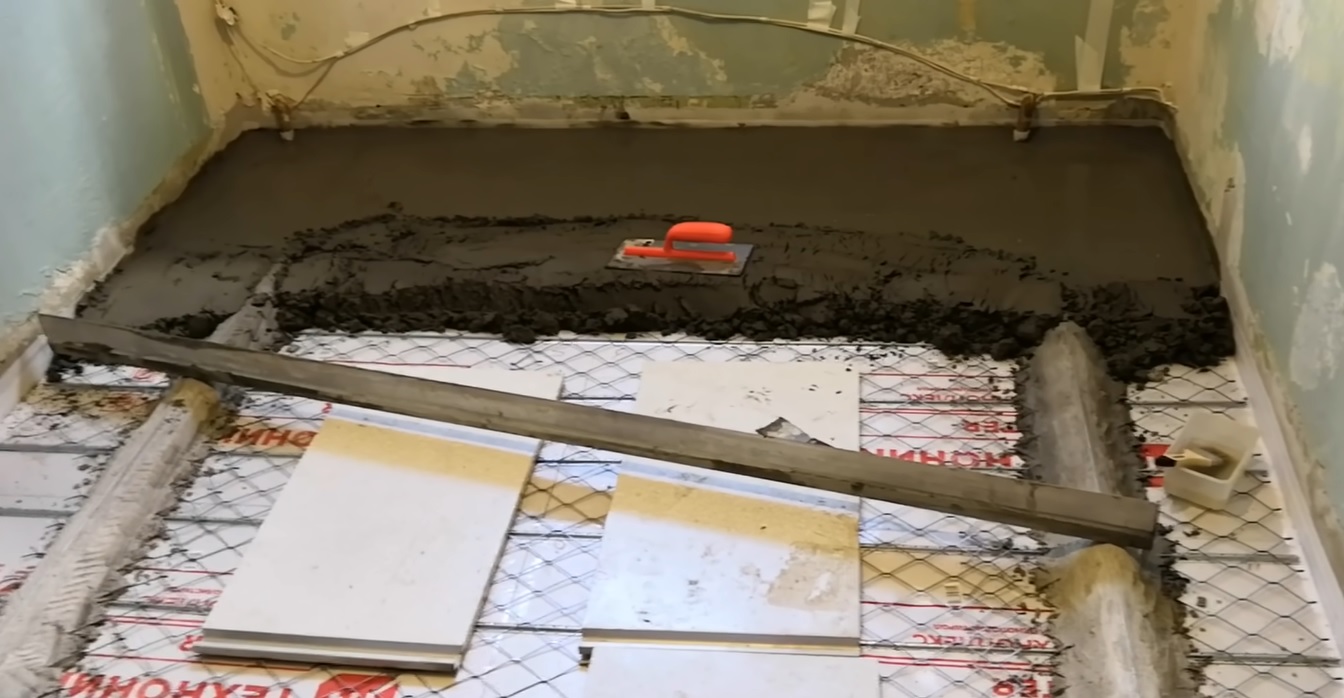 - Цементно-песчаная стяжка, выполненная по Техноплексу выравнивается правилом по направляющим