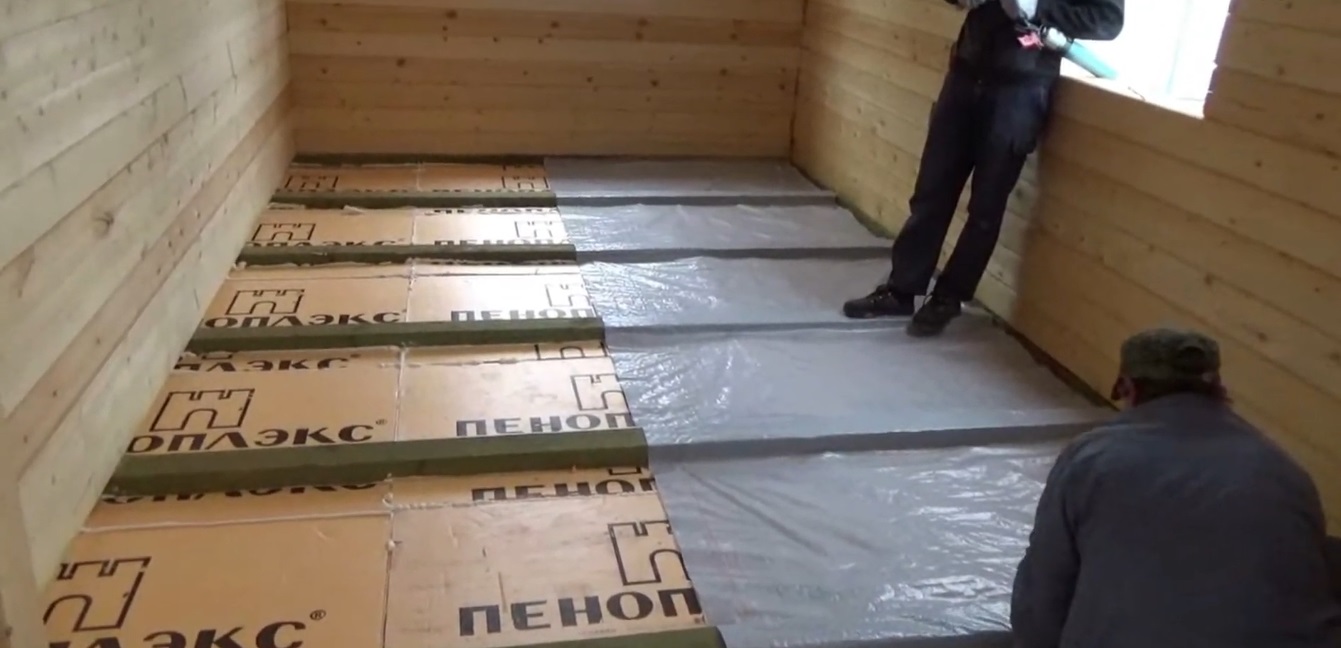 Сверху пеноплекса кладется пароизоляционная пленка. Она выполняет роль пароизоляции. На пароизоляцию монтируются листовые материалы: фанера или ОСБ. На них кладется напольное покрытие. Это может быть половая доска, ламинат и т.д.