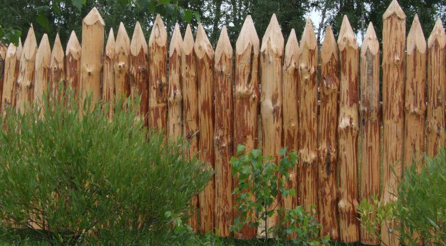 бревен, которые остались после строительства дома или бани – не обязательно, чтобы они были одинаковой формы, из них можно сделать заграждение, напоминающее цветные карандаши, их головка будет острой