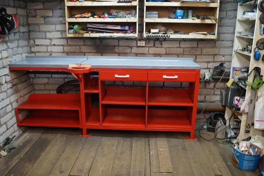 Все края тщательно обрабатываются и зачищаются, острые углы закругляются. Готовое сооружение красят, после высыхания краски производят установку освещения, размещают инструмент, крепят тиски, наждак и прочие необходимые приспособления.
