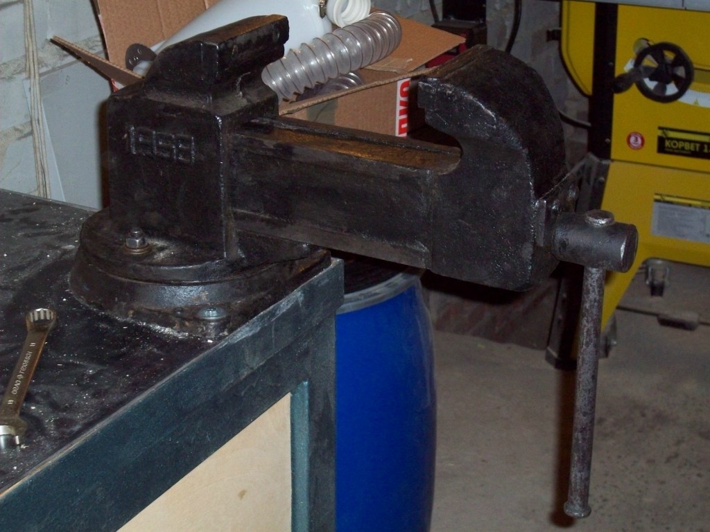 Тиски — это непременный атрибут слесарного верстака. Прикреплять зажимной инструмент, весящий несколько десятков килограмм к самой столешнице не рекомендуется. Лучше всего между металлом стола и инструментом разместить металлическую прокладку, толщиной в 1 см. В прокладке требуется просверлить отверстия под анкерные болты. Затем в тех же местах просверлить в столешнице такие же по размеру отверстия. Скрепливается вся конструкция анкерными болтами.