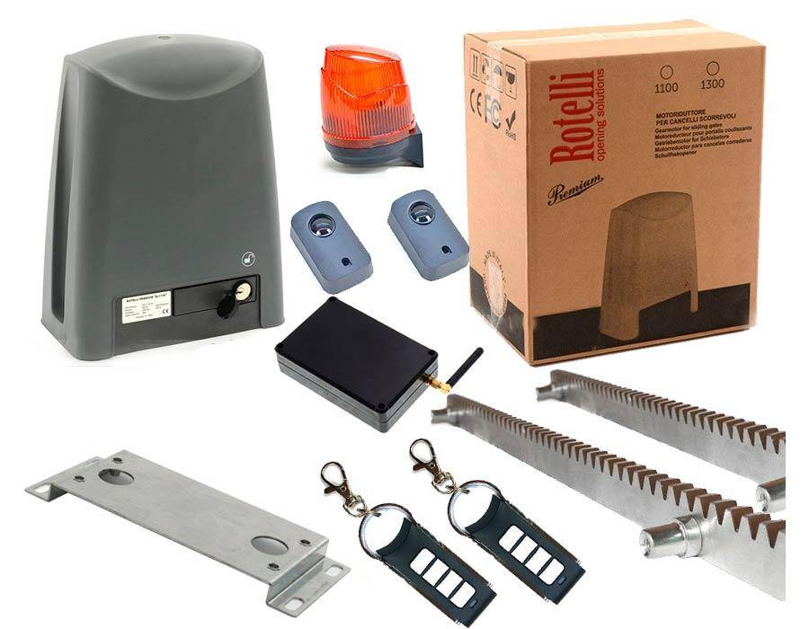 Rotelli Premium 1100 LUX. Устанавливается на откатные ворота. Идеальное соотношение цены и качества. Комплект включает мощный металлический мотор-редуктор, который гарантирует длительный ресурс. Для управления используется миниатюрный 2-х канальный пульт дистанционного управления и GSM-модуль.