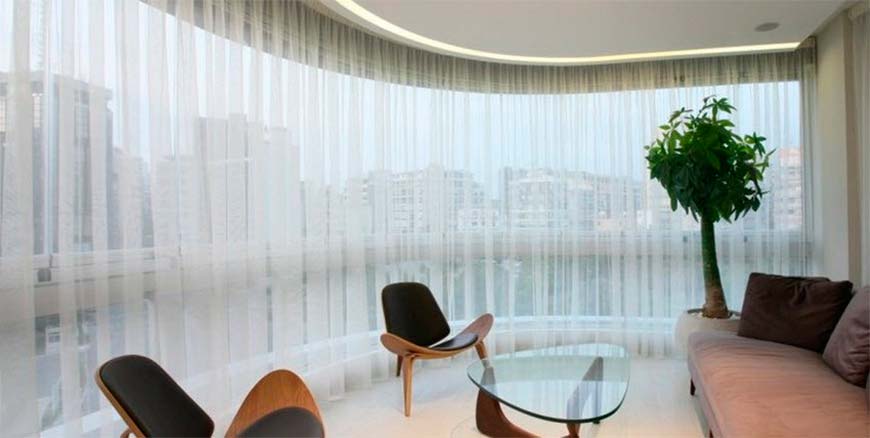 В комнатах, оформленных в стиле фьюжн, предполагающем наличие большого количества различных дизайнерских решений в одном помещении, белоснежные шторы выполняют объединяющую функцию.