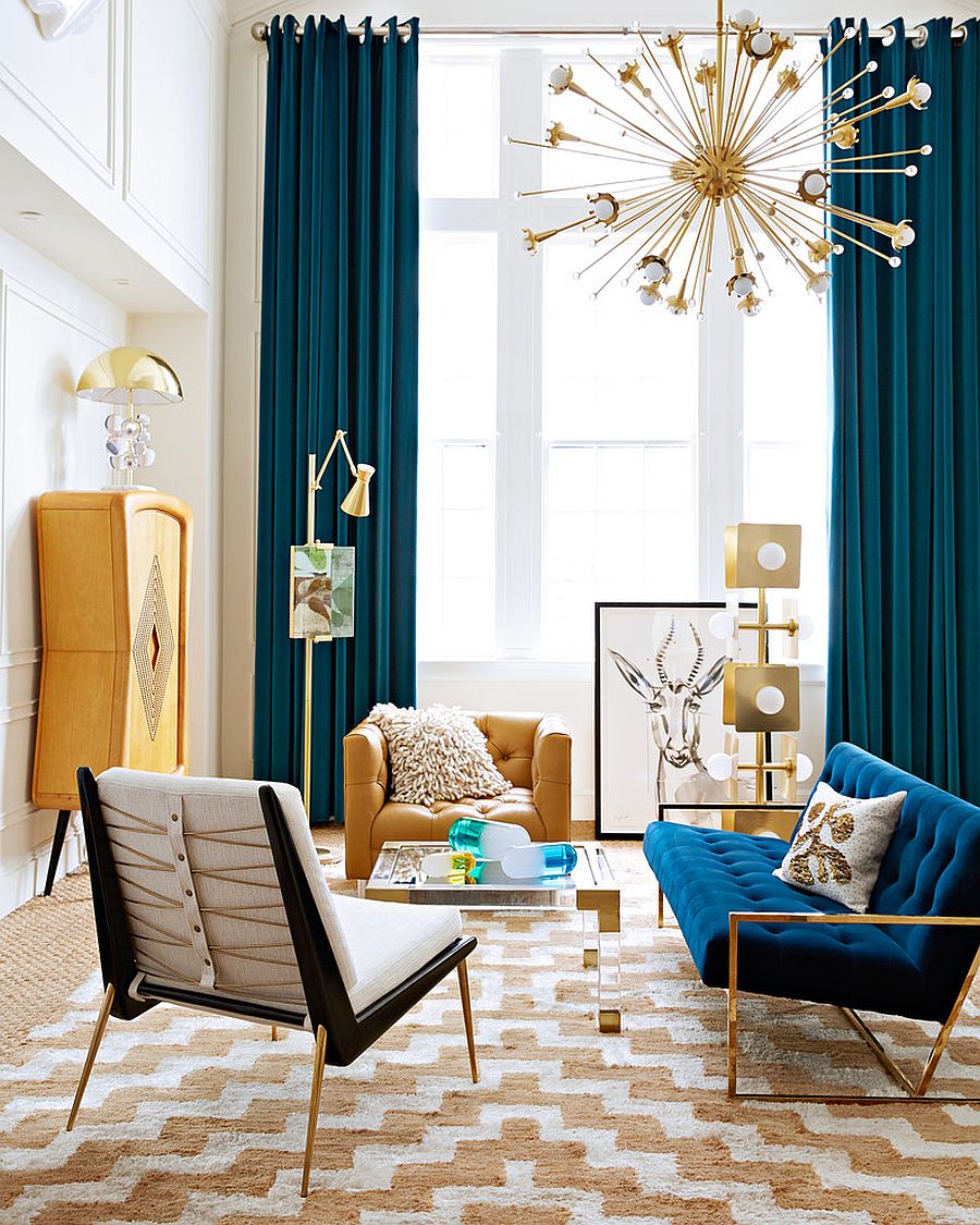 Синие шторы сделают интерьер лаконичным. Советуем разбавить эту цветовую гамму золотыми и белоснежными оттенками.