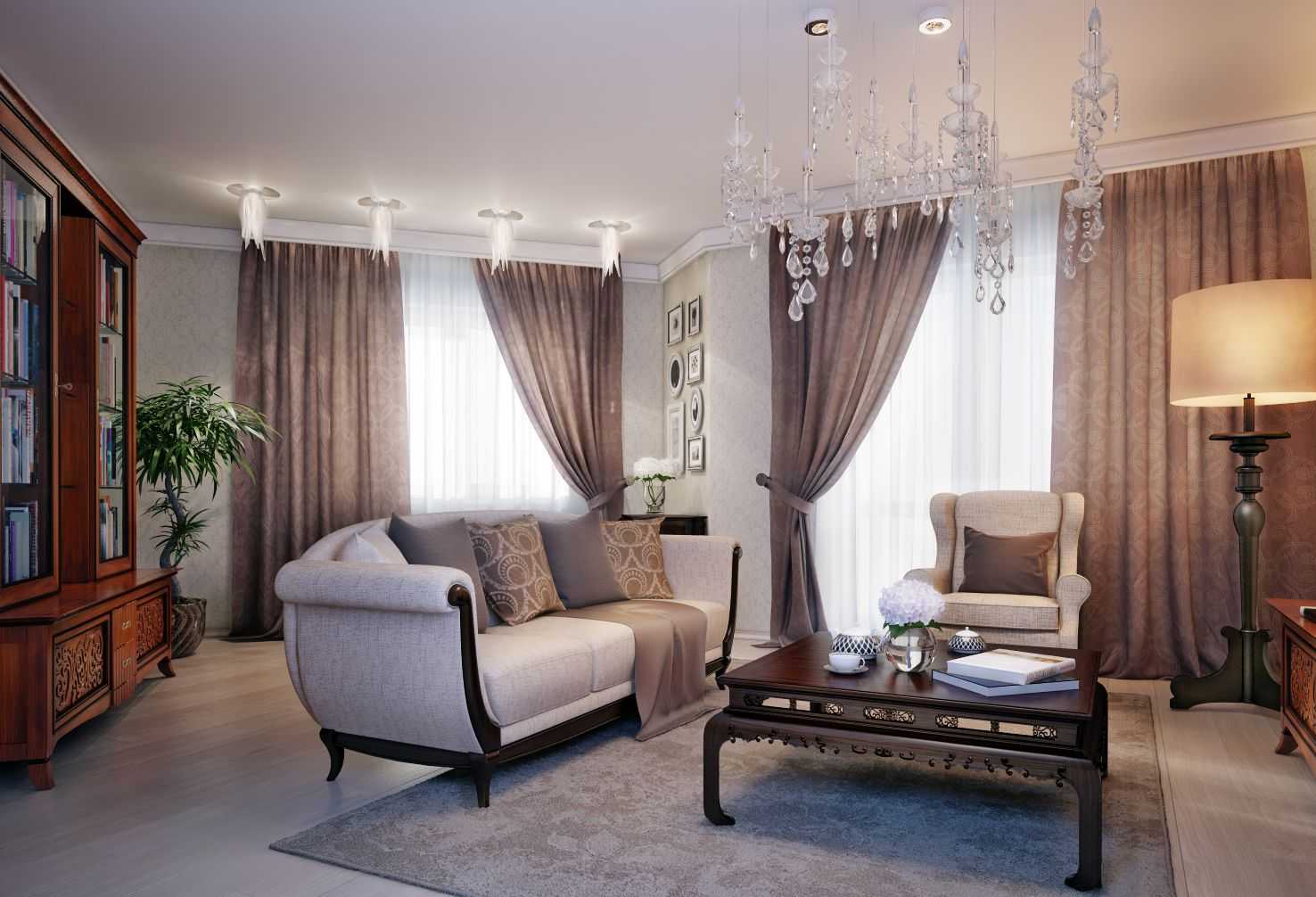 В классическом стиле дополнительные декорирующие элементы только дополняют и украшают дизайн. Цветовая гамма должна полностью сочетаться с интерьером гостиной.