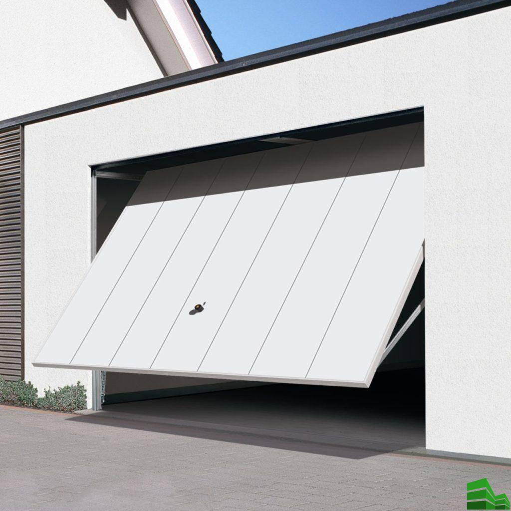 Они представляют собой целостный щит. Это полотно закрывает полностью входное пространство. При открывании оно приподнимается и проворачивается на 90°. В итоге, оно оказывается в горизонтальном состоянии в верхней части.