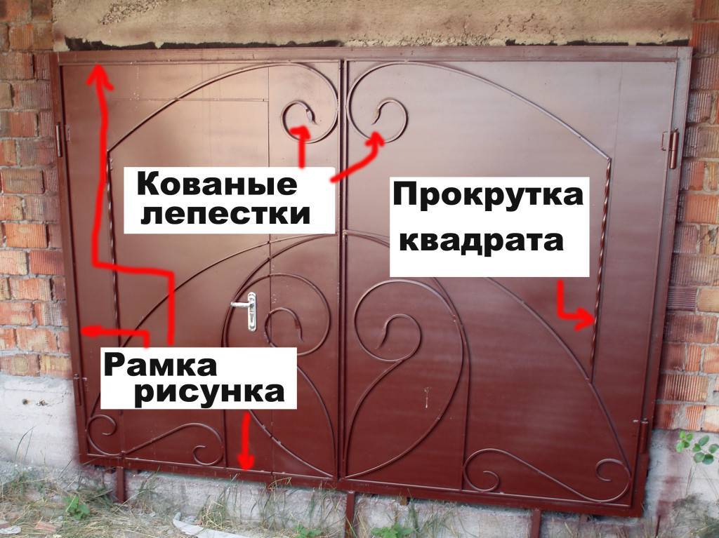 На створки ворот из профильного листа для повышения декоративных качеств и дополнительной жесткости допускается закреплять отдельные кованые детали, которые укрепляют таким образом, чтобы создать гармоничный рисунок.
