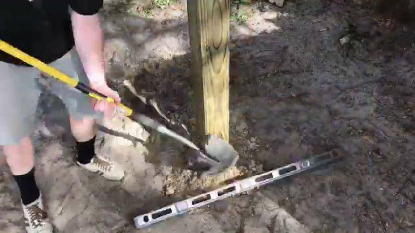 Если в качестве опор выбраны деревянные или железные столбики, то отрываются ямы. Глубина ям должна быть не меньше 1 метра, иначе забор попросту «поплывёт». Надо учитывать, что верхние слои земли и почва очень подвижны. Перед установкой в грунт, столбики из дерева обрабатываются специальным веществом, оберегающего от процессов гниения. Столбики можно установить также в бочку или другой сосуд цилиндрической формы, а затем залить цементным раствором.