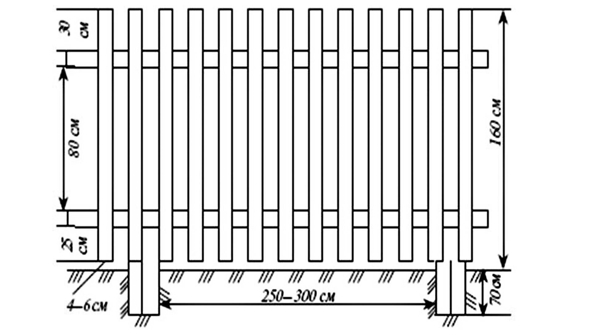 Изгороди такого типа отличаются способом установки, размерами пролетов и зазорами между элементами конструкции. Их устройство не самое сложное.
