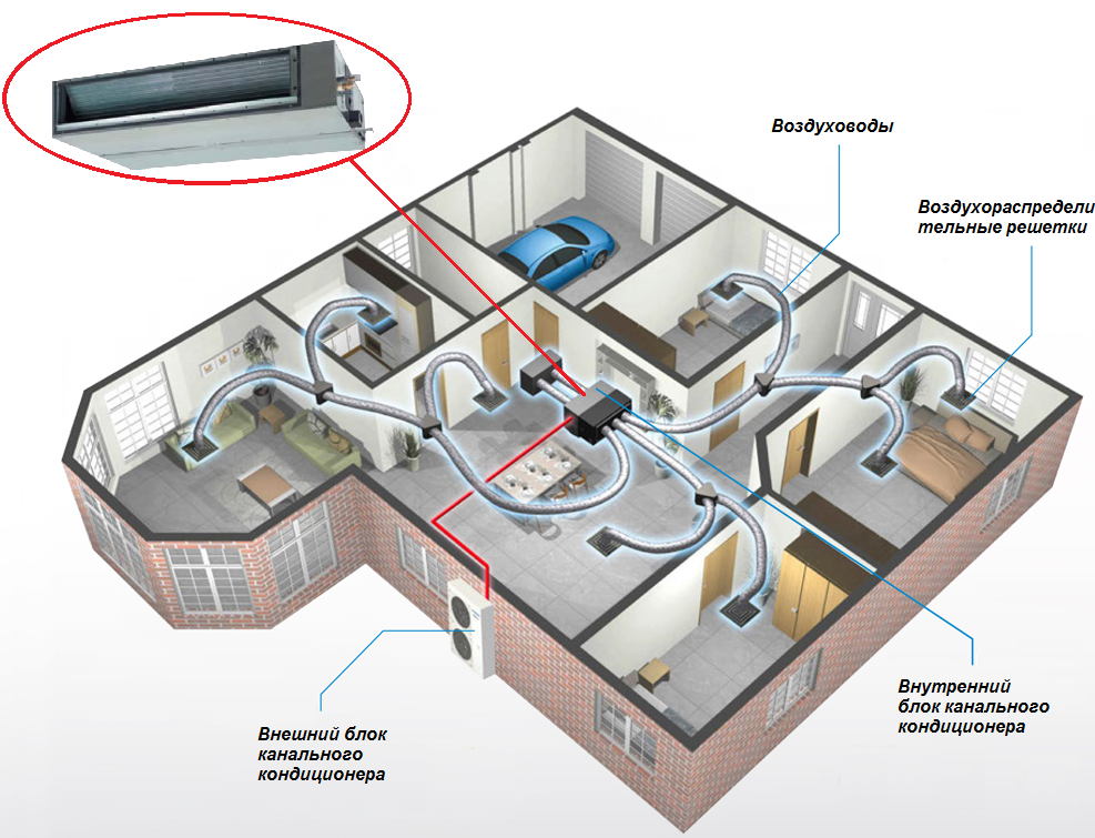 Само назначение канальных кондиционеров заключается в том, чтобы кондиционировать воздух сразу в нескольких комнатах или помещениях в одном здании. Это осуществляется за счет прокладки отдельных воздуховодных магистралей от одного внутреннего блока. При этом нет необходимости монтировать в каждую комнату индивидуальный внутренний блок.