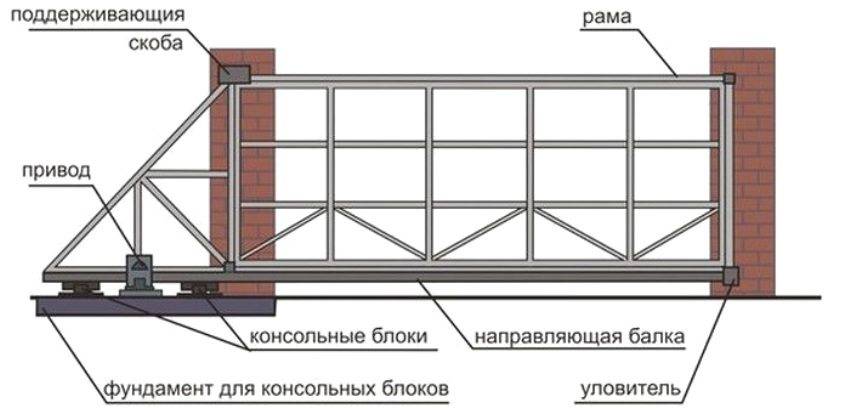 Эта конструкция хороша тем, что над проездом нет балок. Но она — самая дорогая в устройстве. Дело не столько в системе роликов, сколько в необходимости устройства фундамента с металлическими закладными, к которым затем будет крепиться консольная балка. Если столбы уже есть, фундамент заливается перед ним и вдоль забора на длину технического выноса, который необходим для компенсации нагрузки, создаваемой полотном.