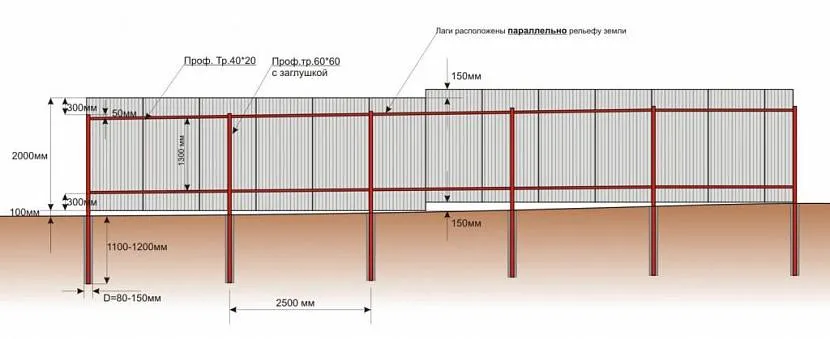 И если расстояние между столбами забора из профнастила выбрано больше допустимого, то это вскоре выразится на конструкции в виде наклонившихся столбов, прогнувшихся листов и других неприятностей. Причем небрежность в расчетах может привести к серьезным финансовым потерям, например, переделке кирпичных и бетонированных опор.