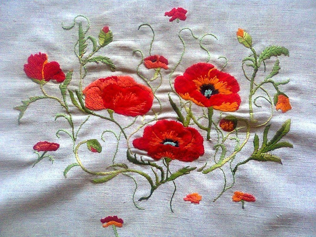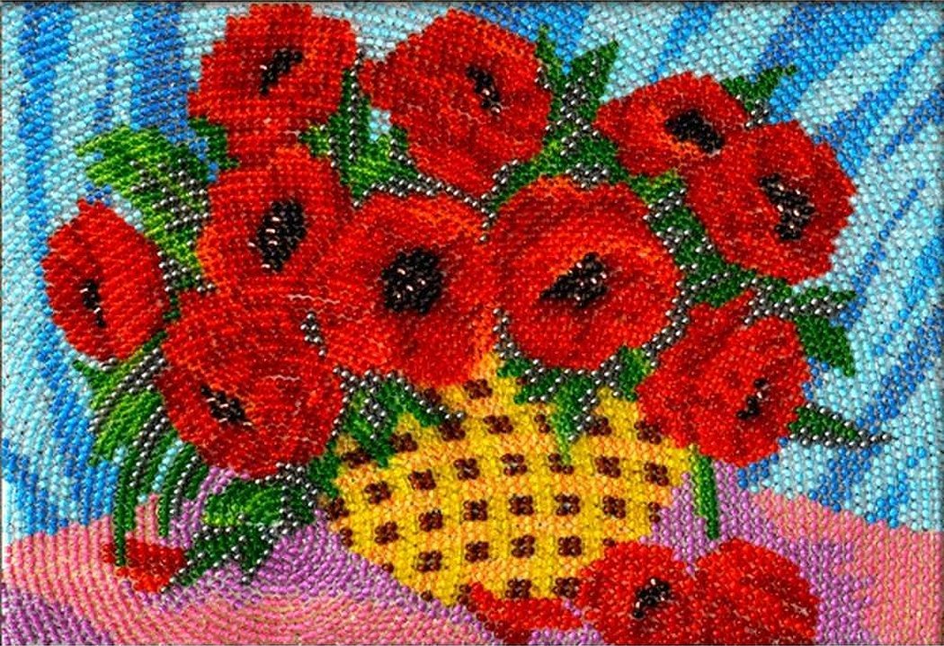 В данной работе нужно использовать больше красного и зеленого. Начать работу лучше снизу и постепенно подняться наверх. Работать по цвету не стоит, можно легко все перепутать. Подбор нитей осуществляется по усмотрению мастерицы. По бокам ткань лучше прошить, чтоб не допустить распускания. Выгоднее выглядят маки распущенные.