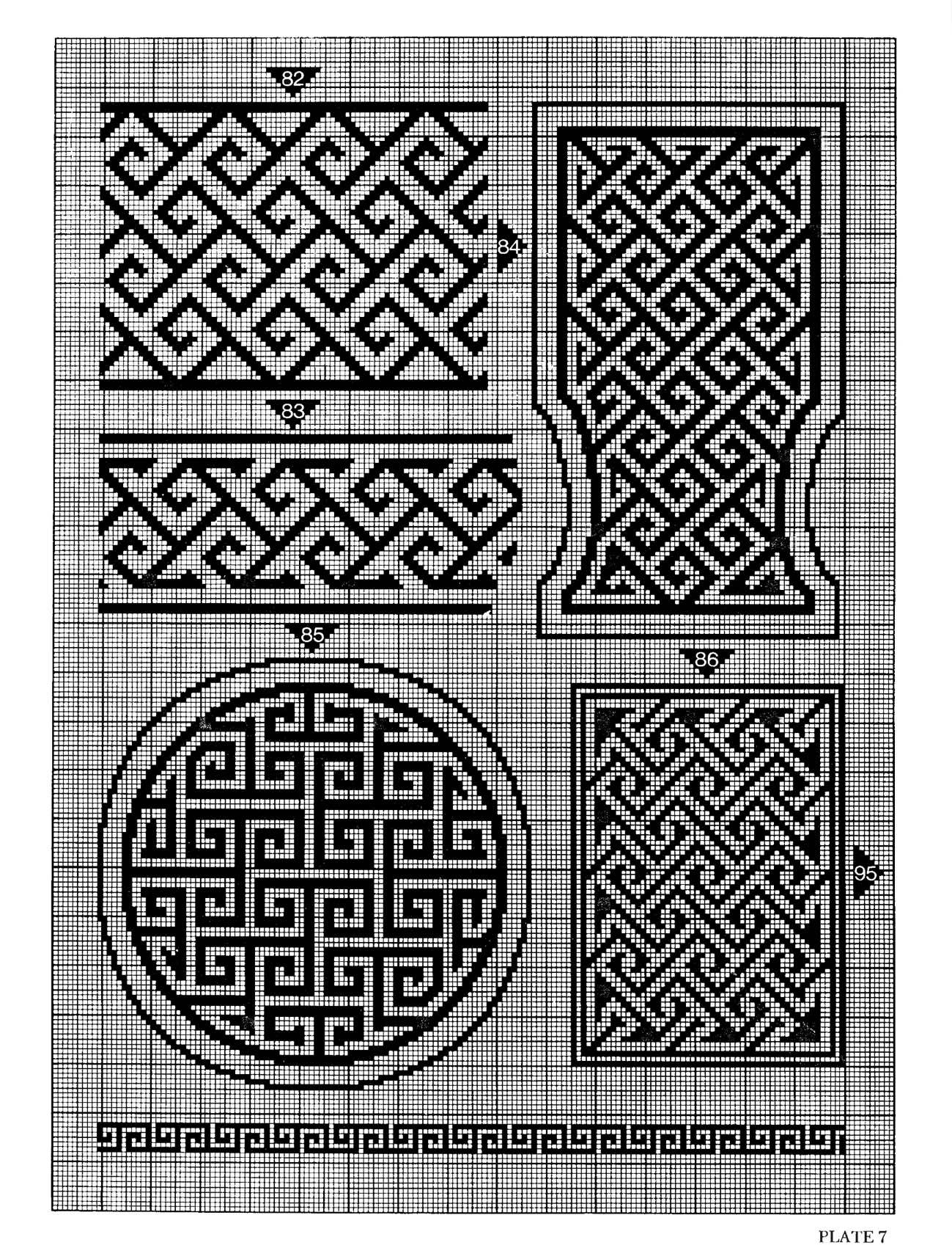 Ленточные узоры выполняются полосой по краю или в середине изделия, полностью поверхность заполняется сетчатым орнаментом, а розеточный украшает середину, отделённую в ромб или квадрат. Основным мотивом геометрических орнаментов является ромб с различными переплетениями и делением его диагоналями. На самом деле схем вышивания таких орнаментов огромное множество. Цветовая гамма играет большую роль в вышивке.